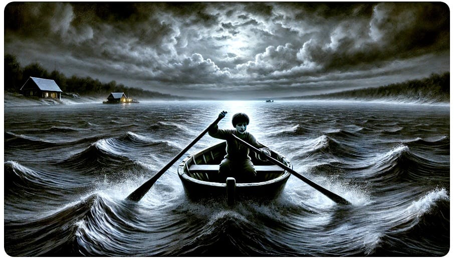Мокрая чернота воды вокруг казалась живой, тяжелой, враждебной. Лодка выглядела маленькой щепкой на поверхности этой бездны. Волны тихо дышали, иногда громко плескались, как будто пытались схватить и утянуть мальчика за собой. Липкий страх оседал на плечах, сковывая движения. Но Давид упрямо греб, стараясь держаться прямо.