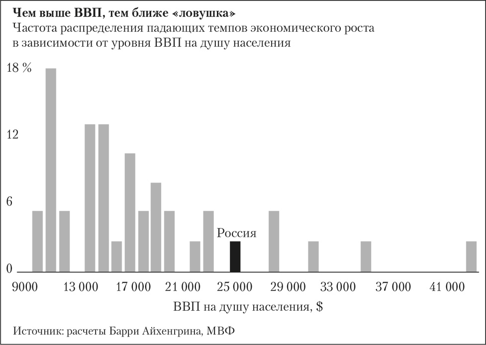 Дальше всех в изучении вопроса продвинулся профессор Калифорнийского университета Беркли Барри Айхенгрин. По его расчетам, быстрый рост экономики замедляется при достижении уровня подушевого ВВП $ 11 тыс. (по ППС в ценах 2005 г.). Но, сумев преодолеть этот барьер и обеспечив дальнейший рост, страна рискует угодить в следующую ловушку – при отметке примерно $ 15–16 тыс. Как только это случается, темпы роста падают со средних 5,6 до 2,1 %. Затем следует период долгого восстановления, не всегда успешный – некоторые страны так и остаются в ловушке[19].