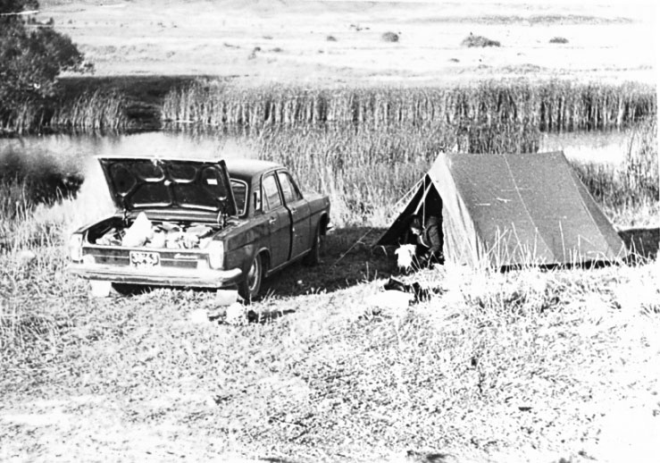 Отъехали немного в сторону, принесли от железной дороги щит, на который положили надутые матрацы. Съели дыню и легли спать. Мама, как и в горах, залезла в машину первая. А остальные пошли через «гору» (насыпь железной дороги) – посмотреть на Балхаш (имеется ввиду – озеро) и искупаться. Но сначала до воды нужно преодолеть метровый глубиной слой ила – иначе не искупаешься…