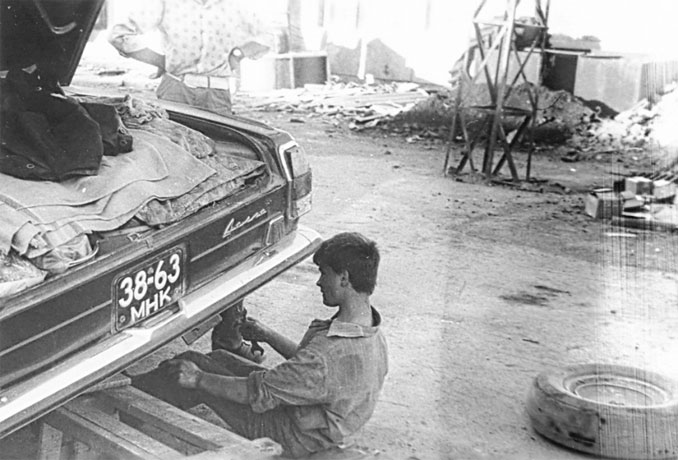 Наконец, окончили собирать машину: рессору (в спешке рессору поставили не тем концом), заложили в багажник все вынутые вещи.