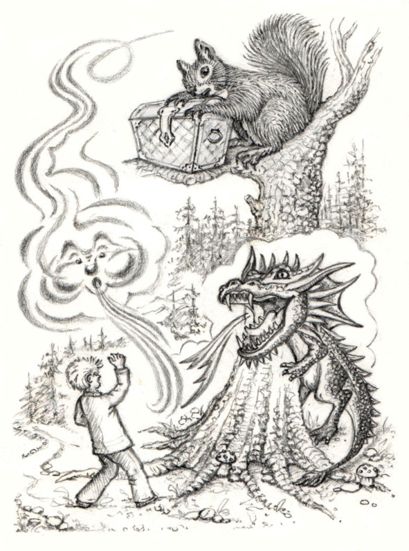 Ветер дунул – в другую сторону гарь направил. Чудище замерло на минуту, а потом как дыхнуло огнём. Никита не удержался на ногах, в сторону отлетел. Ветер и тут ему помог: в другую сторону от него огонь направил. Разозлилось Чудище, и в третий раз на Никиту в упор огнём дохнуло. Ветер и тут Никите помог. Между ним и огнём пролетел. Погасил Ветер огонь. Очистил воздух от дыма и гари. Направил дым на вершину дерева, откуда белка за ними наблюдала. Белка на минуту упустила из виду гнездо с золотым ларчиком. Ветка пошатнулась. Ларчик открылся, и из него золото на землю посыпалось.