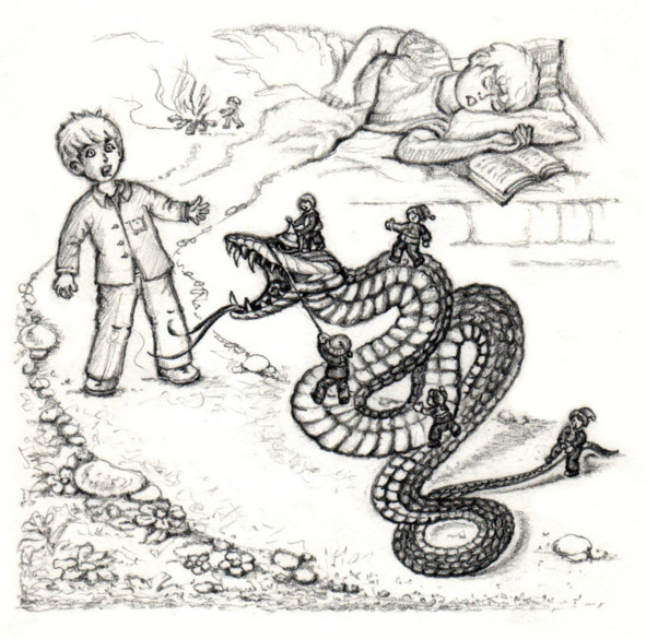 А тут пятый гномик по ней пробежал, тонким прутиком в ноздре пощекотал. Она сначала заурчала, потом на землю упала, заёрзала на одном месте. Сбросить гномиков попыталась, но не получилось. Приплясывать начала. В это время шестой гномик костёр на полянке развёл, а Тишка в сторону огня побежал. Змея успела его за красный колпачок ухватить, пыталась голову откусить. Тишка увернулся, а змея в огонь упала. Зажарилась намертво.
