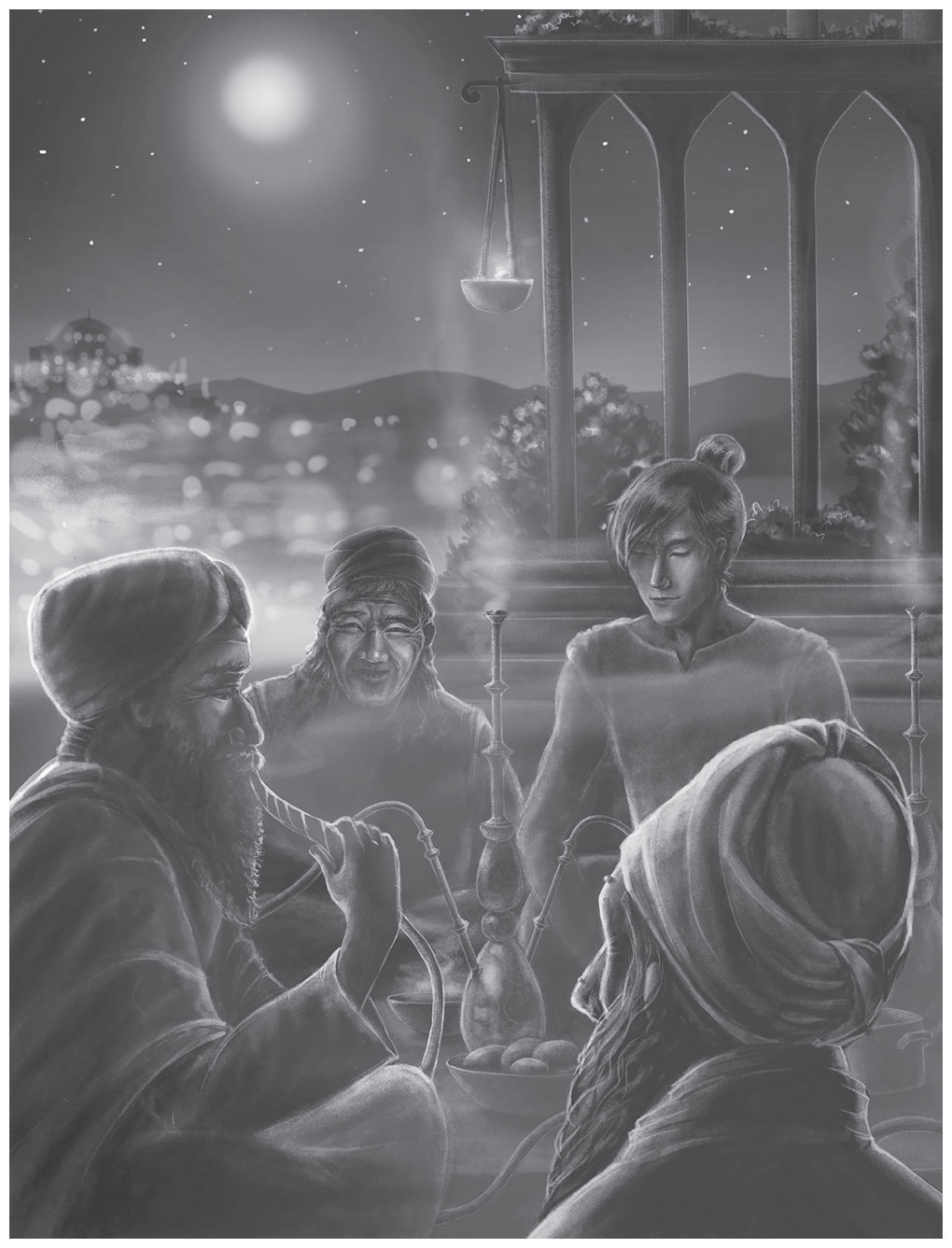 «Потом» наступило не скоро. Вей съел и вашерми, и с пяток других лепешек с вкуснейшими начинками, истекающими соком, и сам не заметил, как на улицы опустилась темнота. Из зала пекарни они переместились под звездное небо, на ковры, постеленные прямо на мостовую, а пожилой Фехил выставил вокруг с десяток плошек с горящим маслом для освещения. Город с наступлением ночи словно стряхнул с себя дневное оцепенение из-за жары и ожил. Улицы были полны народу – у домов по соседству и дальше по улице также горели огни и сидели люди. К пекарне то и дело подходили другие старики, здоровались с хозяином и дедом Амфатом и усаживались на ковры, и вскоре молодой Ши обнаружил себя в окружении веселящихся, радостных людей. Кто-то наигрывал тонкую мелодию на маленьком струнном инструменте, формой похожем на разрезанную пополам луковицу, кто-то ставил на угли жаровни пузатый огромный чайник, серо-глиняный, расписанный синими цветами и пташками и черный от сажи снизу; в чайник сыпали ароматный чай. Незаметно появились несколько кальянов; пекарь разжигал их, смешно раздувая щеки с седыми пышными усами, доросшими до ушей; пахло древесным дымком, кофе и розами.