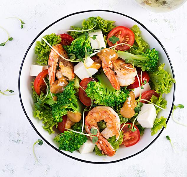 Форму для салата сбрызгиваем маслом, укладываем креветки по кругу как на фото, центр заполняем салатом, кладём в морозилку на 10-15 минут, достаём, переворачиваем на тарелку и украшаем пророщенным лучком.
