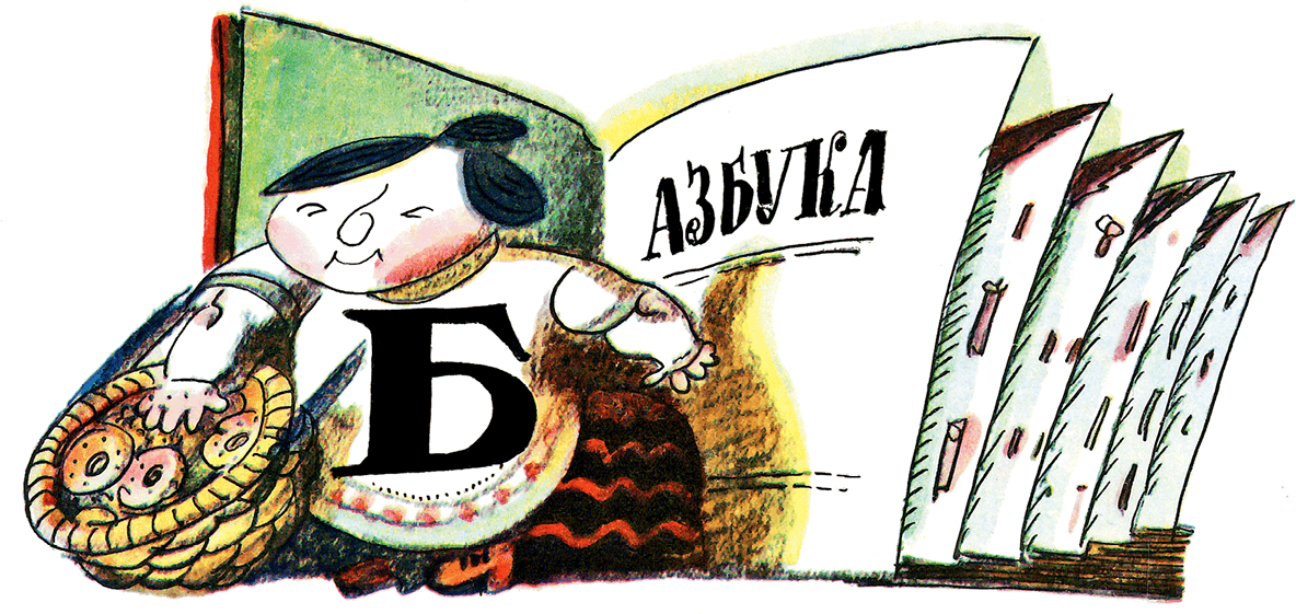 Буква Б была ужасно толстая, Аля и буква А никак не могли её обойти. Пришлось покупать бублики. Они купили их целую строчку, вот такую: