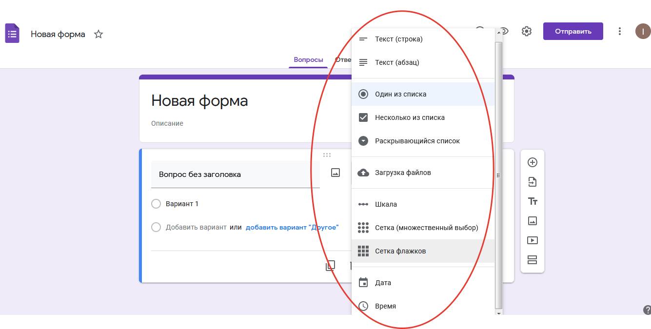 В Гугл формах представлены следующие типы вопросов: