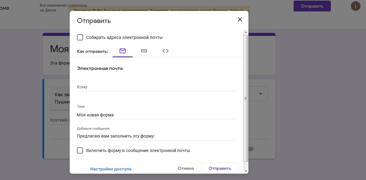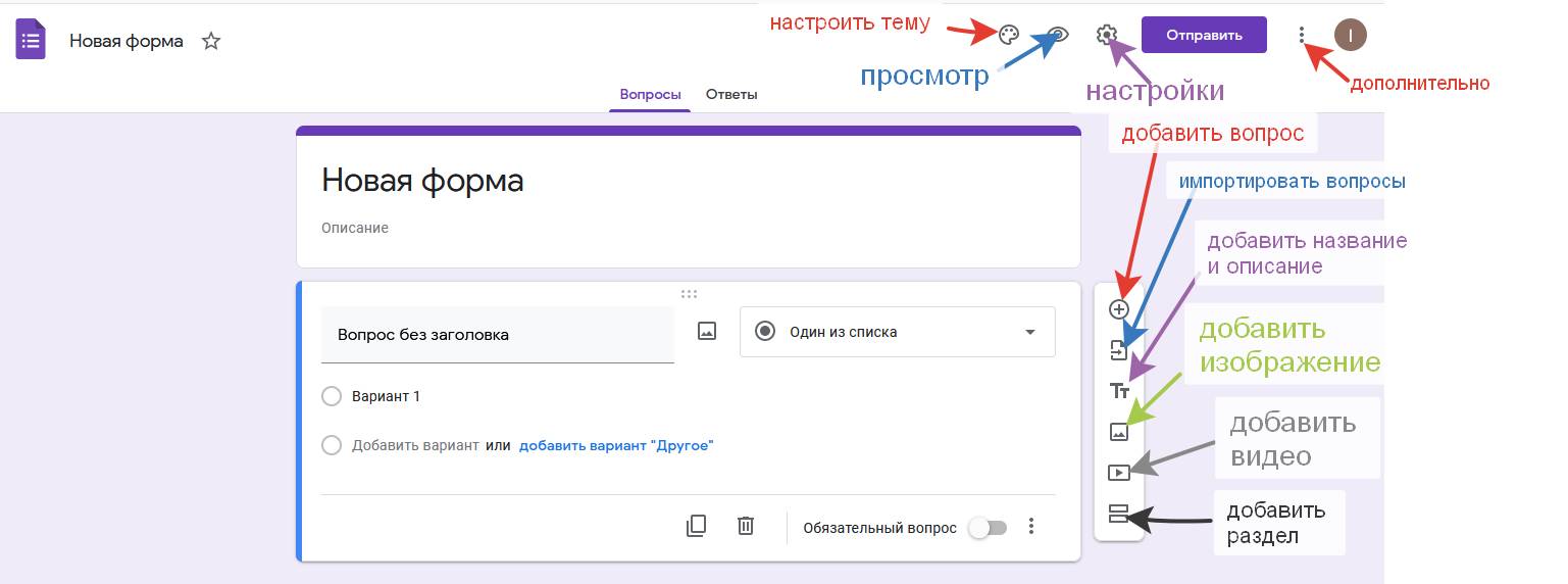Предположим, что наша анкета состоит из одного вопроса, чтобы сразу посмотреть, как её отправлять и где искать результаты. Вверху справа есть кнопка «Отправить»: