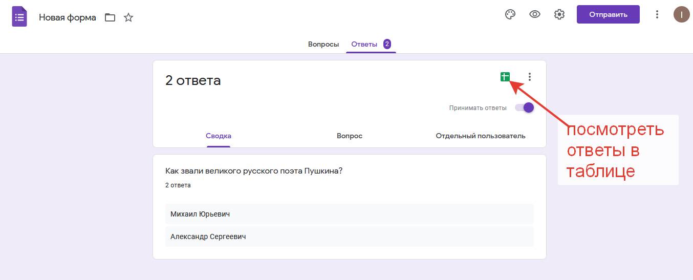 Кликаем по зелёному квадратику с белым крестиком, ассоциирующимся у нас с таблицами Excel «Посмотреть ответы в таблице». И вот что мы увидим: