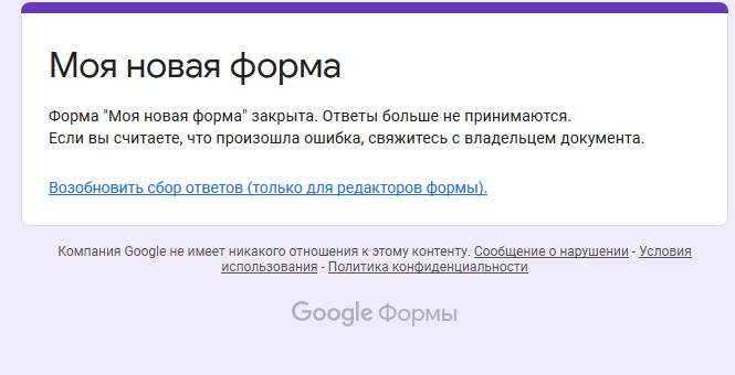 Вот так мы увидели, какие ответы получили на наш вопрос. Обратите внимание, что переключатель стоит в положении «Принимать ответы». Предположим, что мы больше не хотим, чтобы на нашу анкету продолжали отвечать. Переключаем в положение «Не принимать ответы». Вот что увидим мы, авторы анкеты: