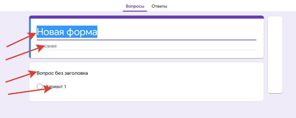 Вписываем своё название. Аналогично вместо слова «Описание» впечатываем описание вашей формы. И переходим непосредственно к вопросам. В результате того, как мы заполнили поля, получился примерно следующий вид: