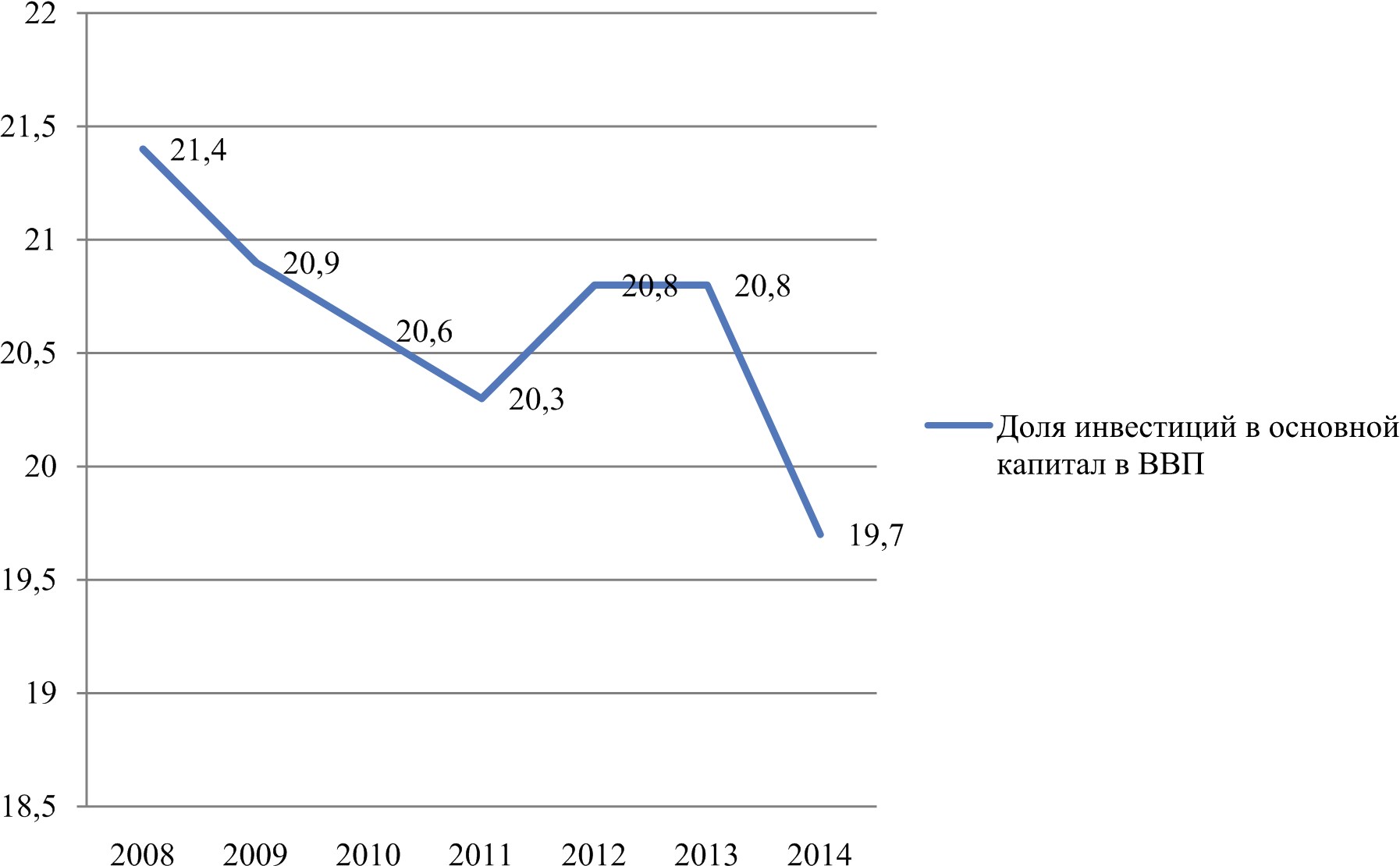 Рис. 3. Динамика изменения доли инвестиций в основной капитал в структуре ВВП России в 2008–2013 гг.8