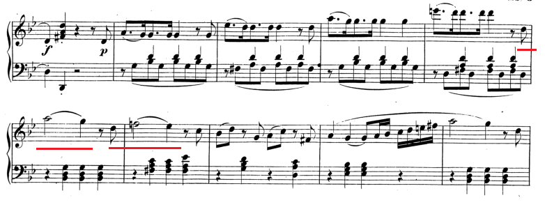 А это уже символ: если возникает прерванный оборот, это означает только одно: нет логического завершения, ответ не найден, дилемма не решена. В нашем случае Моцарт не знает на ком остановить свой выбор, кто ему милее Софи или Констанца. А что дальше? А дальше снова вопрос: Софи или Констанца? И снова гармония неопределенности – прерванный оборот. Три раза возникает этот прерванный оборот, Моцарт не может никому из них отдать предпочтение и в результате он отклоняется в тональность шестой ступени (этой самой неопределенности – ми бемоль мажор), и уже на эту территорию переносится душевное смятение, а оно достаточно сильное. Моцарт не очень любит звучание минорных гармоний (из 19 фортепианных сонат только 2 написаны в миноре, все остальные в мажоре, Моцарт очень светлый композитор), а здесь мы слышим на моторном рокочущем аккомпанементе и до минорную гармонию и даже, что вообще невероятно, ми бемоль мажор меняет лад и становится ми бемоль минором. Это говорит только об одном: в душе у Моцарта разыгрывались не шуточные страсти по поводу сестер Вебер. А дальше? Ми бемоль минор приравнивается к четвёртой альтерированной ступени си бемоль мажора (основная тональность), переводится в доминантовый квинтсекстаккорд (неустойчивая гармония, требующая разрешения) и ВСЁ!!!