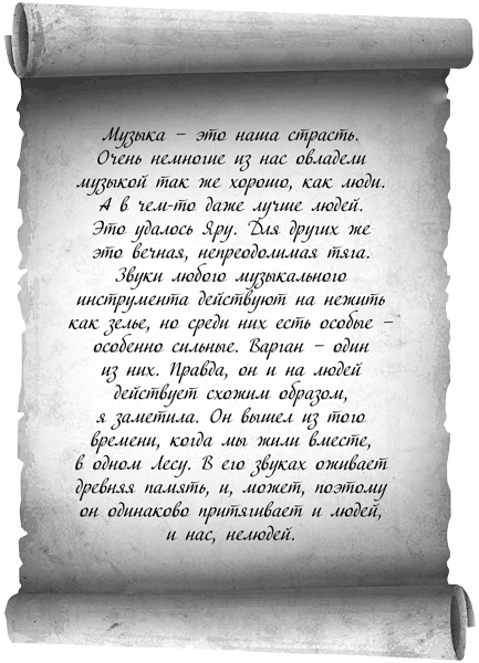 Я играла, не понимая как, звуки переливались в черепной коробке, уводили за собой, размывая представление о теле и времени. Мне казалось, я проваливаюсь в забытье, в смутные глубины Леса, откуда нас вытягивает с такой настойчивостью. Не потому ли я так ужасно, так нестерпимо алчу, оказавшись среди людей, так яростно принимаюсь за охоту, что мне не хватает его – нашего мшистого, прелого, заговорённого, счастливого небытия? Кто сказал, мой Яр, что наше предназначение – выйти из него навсегда? Выйти, как сделали некогда люди, которые только лишь воспоминание одно о Лесе носят теперь в душе. Кто сказал тебе, Яр, что несчастны наши братья, оборотни и русалки, потерявшие облик и способность быть житью? Кто сказал тебе, что сам ты становишься всё более счастливым, изживая Лес из себя, всё больше и больше уподобляясь человеку?