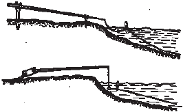 При ловле на донки их следует наживлять с вечера. Можно установить и полудонки, которые хорошо работают как на тиховодье (рис. 1), так и на течении (рис. 2). Приманку обычно забрасывают на чистую или освобожденную от коряг песчаную отмель рядом с подводными ямами и коряжником.