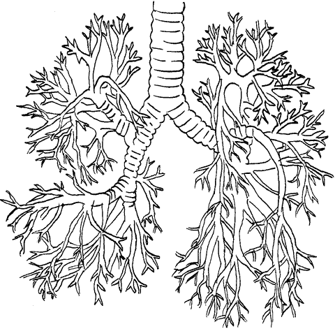 Бронхиальное дерево представляет собой систему сосудов, делящихся, как ветки деревьев. Ствол дерева – это трахея, а ветви – бронхи. Количество сегментарных делений бронхов (по разным моделям) – от 16 до 23. Дальнейшее парное деление сегментарных бронхов увеличивает их число до 100 тыс. Самые маленькие бронхиальные сосуды имеют диаметр не более 1 мм. Конечные разветвления бронхов называются бронхиолами. Они образуют пористую (губчатую) делящуюся сеть, по которой осуществляется движение воздуха к альвеолам, где и происходит насыщение крови кислородом. В бронхиолах воздух очищается от пыли, микробов и прочих частиц, которые осаждаются в просвете бронхов. Процесс очищения воздуха от примесей называется в медицине мукоцилиарным (от латинского mucus – «слизь», cilia – «ресничка»). Он происходит с помощью ресничек, расположенных на внутренней поверхности бронхов, которые совершают непрерывные колебательные движения по направлению к трахее и вместе со слизью, находящейся на ее поверхности, выводят все патологические частицы в глотку.