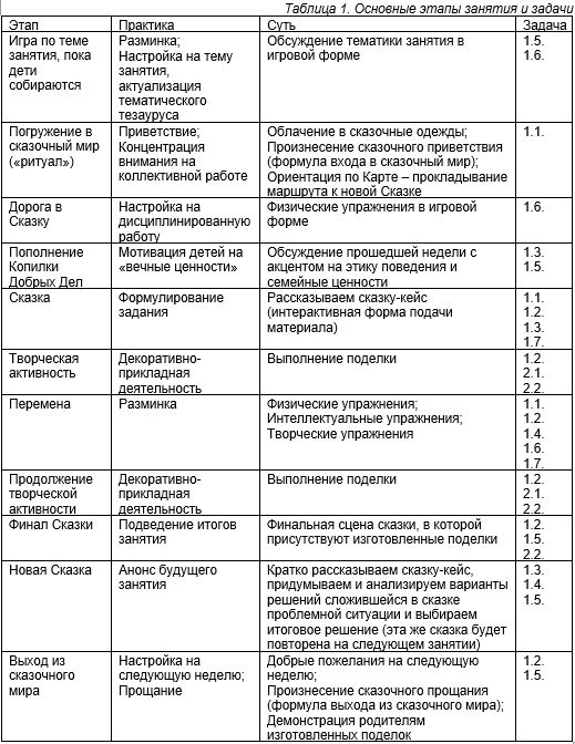 Для достижения перечисленных выше целей и задач разработан ряд практик, которые реализуются на каждом занятии. Ключевой практикой является сказка-кейс. Суть данной практики заключается в рассказывании сказки, в которой присутствует некоторая проблемная ситуация. Вместе с детьми мы обсуждаем варианты решения проблемы, выбираем оптимальный вариант решения. В разных группах детей у одного и того же кейса может быть обосновано и выбрано разное итоговое решение. Итоговое решение подразумевает изготовление какого-либо предмета или существа, что и определяет саму поделку. В некоторых занятиях задействованы двое педагогов, но большинство занятий вполне под силу одному человеку.