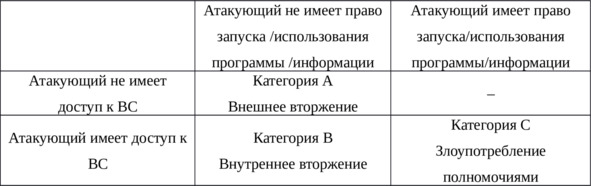 Из приведенной таблицы (таблица 1) можно сделать заключение, что все атаки разделяются на три категории. Ситуация, когда атакующий имеет право запуска или использования программы в отсутствии доступа к вычислительной системе, – невозможен.