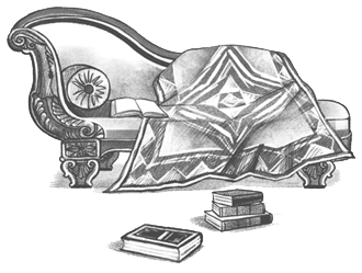 Комната, где лежал Илья Ильич, с первого взгляда казалась прекрасно убранною. Там стояло бюро красного дерева, два дивана, обитые шелковою материею, красивые ширмы с вышитыми небывалыми в природе птицами и плодами. Были там шелковые занавесы, ковры, несколько картин, бронза, фарфор и множество красивых мелочей.