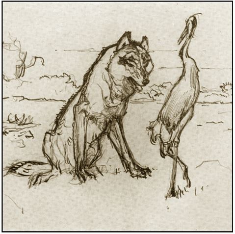 Что волки жадны, всякий знает:Волк, евши, никогдаКостей не разбирает.Зато на одного из них пришла беда!Он костью чуть не подавился.Не может Волк ни охнуть, ни вздохнуть;Пришло хоть ноги протянуть!По счастью, близко тут Журавль случился.Вот кой-как знаками стал Волк его манитьИ просит горю пособить.
