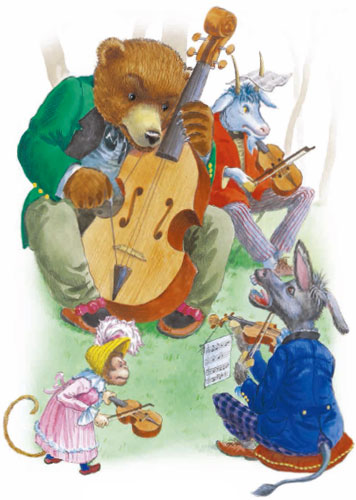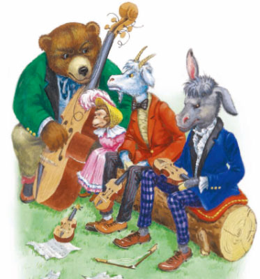 Проказница-Мартышка, Осёл, Козёл Да косолапый Мишка Затеяли сыграть Квартет.Достали нот, баса́, альта́, две скрипки И сели на лужок под липки, — Пленять своим искусством свет.Ударили в смычки, дерут, а толку нет.«Стой, братцы, стой! – кричит Мартышка. — Погодите!Как музыке идти? Ведь вы не так сидите.Ты с басом, Мишенька, садись против альта, Я, прима, сяду против вторы[1]; Тогда пойдёт уж музыка не та: У нас запляшут лес и горы!» Расселись, начали Квартет; Он всё-таки на лад нейдет. «Постойте ж, я сыскал секрет! — Кричит Осёл, – мы, верно, уж поладим, Коль рядом сядем».Послушались Осла: уселись чинно в ряд; А всё-таки Квартет нейдет на лад.Вот пуще прежнего пошли у них разборы И споры, Кому и как сидеть.Случилось Соловью на шум их прилететь.