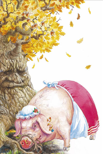 Свинья под Дубом вековымНаелась желудей досы́та, до отвала; Наевшись, выспалась под ним; Потом, глаза продравши, всталаИ рылом подрывать у Дуба корни стала. «Ведь это дереву вредит, — Ей с Дубу Ворон говорит, —Коль корни обнажишь, оно засохнуть может». — «Пусть сохнет, – говорит Свинья, — Ничуть меня то не тревожит; В нём проку мало вижу я;Хоть век его не будь, ничуть не пожалею,Лишь были б жёлуди: ведь я от них жирею». —«Неблагодарная! – промолвил Дуб ей тут, — Когда бы вверх могла поднять ты рыло, Тебе бы видно было, Что эти жёлуди на мне растут». Невежда также в ослепленье Бранит науки и ученье, И все учёные труды,Не чувствуя, что он вкушает их плоды.