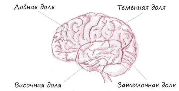 Каждое полушарие поделено на четыре области: лобную (спереди), теменную (сверху), затылочную (позади) и височную (сбоку) доли.