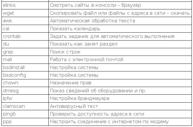Команды могут запускать программы, либо работать сами. Если команда или программа созданы для ответственных действий, влияющих на работу других людей, то, очень вероятно, что эта программа или команда требует работы администратора, или работы от его имени. Рассмотрим некоторые команды и программы из FreeBSD 11. Они во многом такие же что и в Linux. Если программа не поставлена то её нельзя использовать. Набор программ не зависит от архитектуры.