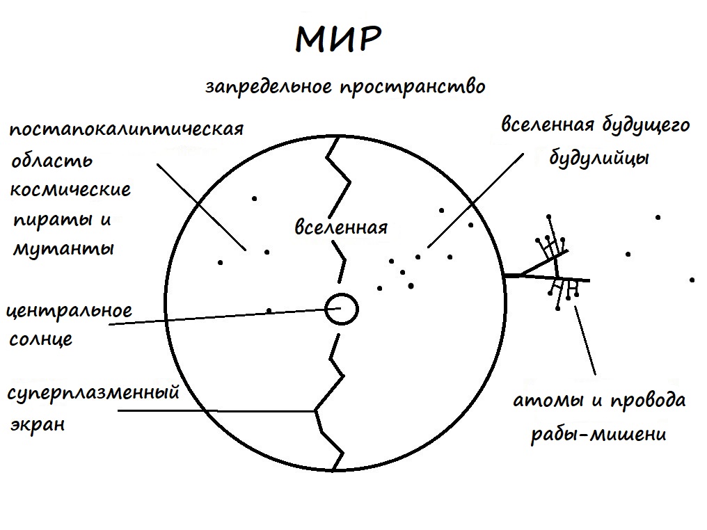 Запредельное Пространство представляло из себя плотную темную субстанцию, и свободное перемещение по нему было невозможным. В этой плотной материи имелись пустоты в виде сфер, в которых находились планеты – так называемые Атомы Запредельного Пространства. Атомы, благодаря гравитации, которой обладали сами и обладала плотная материя Запредельного Пространства, располагались всегда в центре сфер-пустот и имели обыкновенную воздушную атмосферу. Свободное пространство в сфере, не занятое Атомом и его атмосферой, представляло из себя безвоздушное пространство, которое и заканчивалось у границы сферы и плотной материи Запредельного Пространства. Таким образом, ни мишени, ни будулийцы, находившиеся на одном Атоме, не могли видеть другие Атомы, а про звезды на сплошном черном небосклоне и говорить нечего – будто взяли и накрыли планету покрывалом.