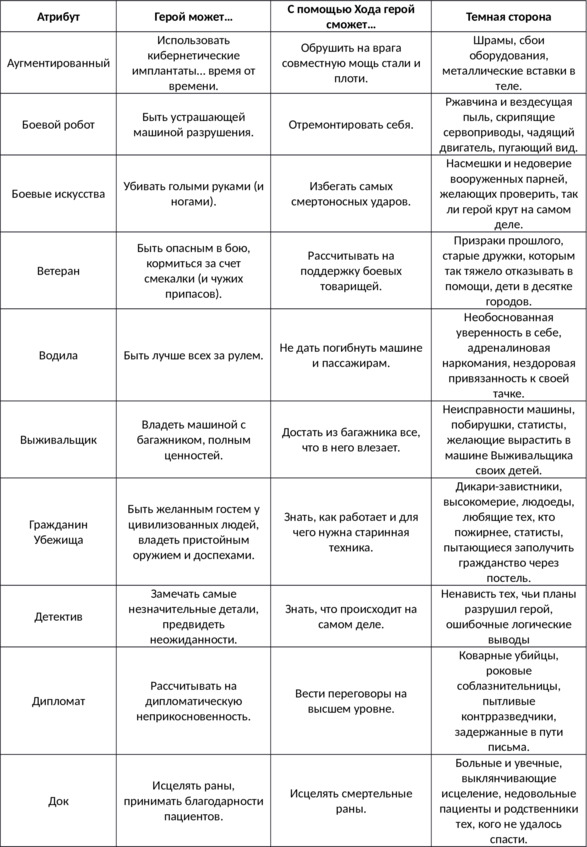 Также по договоренности с мастером игрок может заменить Уникальный ход одного Атрибута на Уникальный ход другого, если это соответствует жанру и настроению игры. Например, игрок может заменить Уникальный ход Техника на Уникальный ход Мусорщика или Гражданина убежища. Замена должна быть оговорена с мастером и произойти до начала игры или приобретения Атрибута.