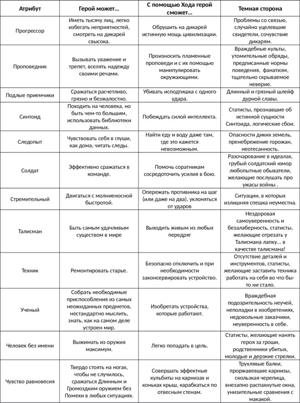 И герои, и статисты могут вполне обойтись (и зачастую обходятся) без Атрибутов. Далеко не каждый проповедник – пламенный оратор, далеко не каждая красавица способна очаровывать окружающих, далеко не каждый офицер отдает толковые приказы. Герой вполне может быть проповедником и занимать формальное место в иерархии культа, родиться миловидным, или получить офицерский чин, но при этом не иметь соответствующего Атрибута. Его приобретение будет означать, что на Проповедника снизошла благодать (или он наконец-то научился ладно излагать догматы и пудрить мозги окружающим), Красавица расцвела (или поняла, как использовать свою красоту в достижении личных целей), а Офицер закалился в боях и заслужил уважение подчиненных (или заставил их себя бояться).