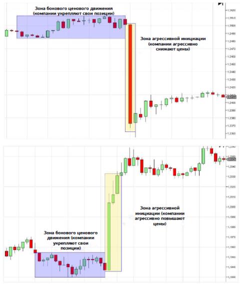 Ниже приведены два типичных примера зоны бокового ценового движения с последующей агрессивной активностью инициации: