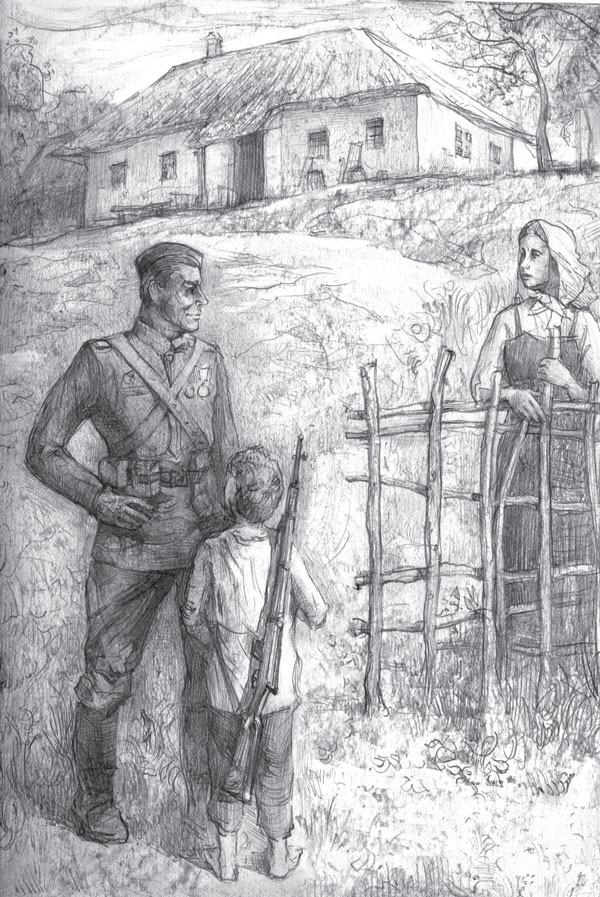И снится ему сон. Как будто сидит он на ступеньке крыльца хаты. По тропинке идет дядько Роман с карабином на плече, с пистолетом в кобуре, висящей на поясе, и гранатами на том же поясе. Идет и улыбается.