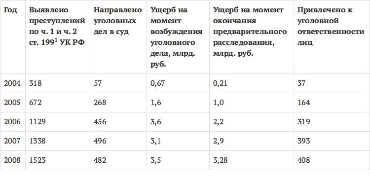 С момента введения уголовной ответственности за неисполнение обязанности налогового агента статистика оперативно-служебной деятельности органов внутренних дел Российской Федерации свидетельствует о постепенном распространении рассматриваемых преступлений и росте их количества (см. таблицу).