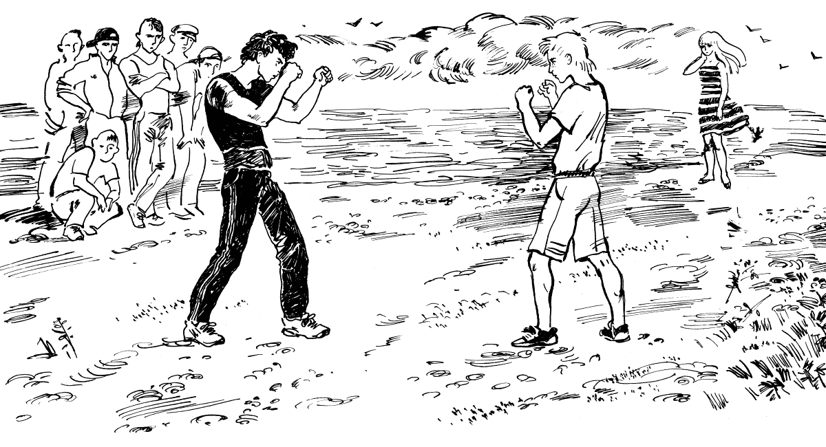 Сергей принял боксерскую стойку, но двигался какими-то каратистскими припрыжками, выставляя вперед то правую, то левую ногу. Сделал прыжок ко мне. Вероятно, ожидал, что я тоже двинусь с места и мы схлестнемся, к радости зрителей, но я остался у кромки воды. Он прыгнул еще раз. Я лишь поднял руки к груди, прикрывая локтями ребра.