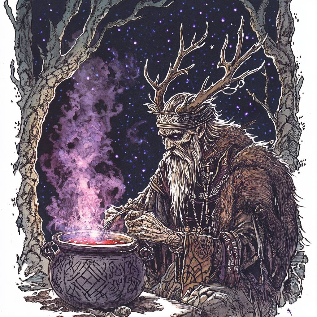 В дремучей глубине лесной чащи, промеж корней дубов, что старше царств земных, кудесник в шкуре, увенчанной рогами оленя-великана, склонился над котлом.