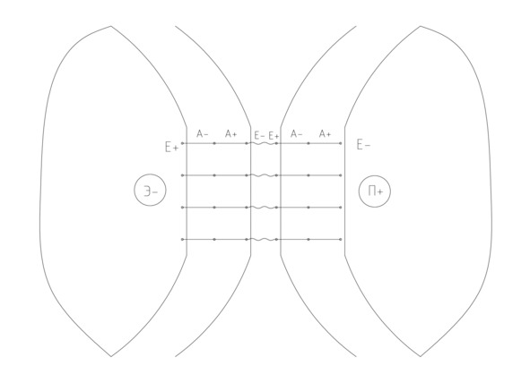 Необходимо отметить, что позитрон и электрон – это энергия, возникающая от приложения усилия для растяжения сдерживающей перегородки, которая жестко скреплена с позитроном.