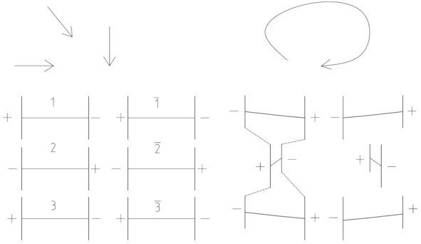 В результате мы получаем «ленту», которая без постоянного приложения усилия стремится снова вернуться в материальную точку. Как сделать так, чтобы «лента» существовала без постоянного приложения усилия? Для этого надо сделать такую же «ленту», но приложить к ней усилие в противоположном направлении. На рисунке 6 сверху вниз показано, как из материальной точки получается одна «лента», затем рядом с первой лентой размещают вторую противоположную «ленту». Теперь необходимо жестко соединить обе «ленты» и после этого можно убирать приложенное усилие Е+ с обеих «лент». В результате на «лентах» останется только усилие Е-, которое будет стремиться вернуть «ленты» обратно в материальные точки. Но из-за того, что «ленты» жестко связаны, возвратное усилие Е- для одной ленты будет являться приложенным усилием Е+ для второй ленты. И наоборот. В результате получится устойчивый кластер, который можно назвать энергонасыщенной материей, существующей без постоянного приложенного усилия.