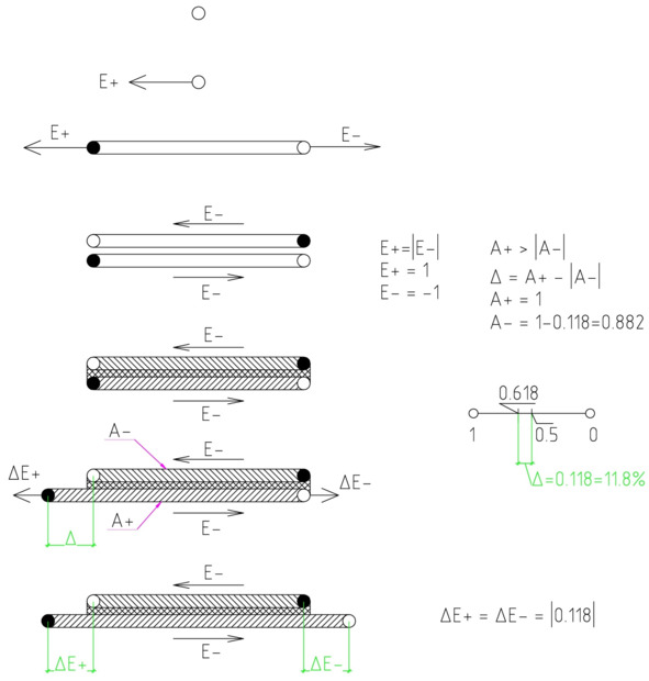 К материальной точке, обозначенной на рисунке 6 в виде окружности в верхней части рисунка, прикладывается усилие Е+. При этом начинает формироваться материя в виде некой «эластичной ленты». При этом лента растягивается сразу в две стороны, хотя что усилие прикладывается только Е+. «Эластичная лента» растягивается на две стороны до достижения определенного усилия. Чем дальше отстоят противоположные стороны ленты, тем больше энергии требуется приложить для ее растяжения.