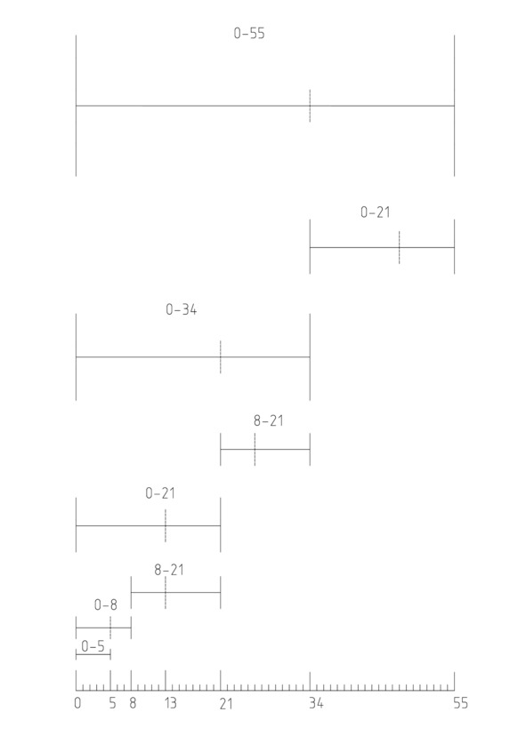 Затем можно построить третий кластер (0—21) из предыдущих двух (0—8 и 8—21). Затем четвертый кластер (0—34) из второго (8—21) и третьего (0—21). Затем пятый кластер (0—55) из предыдущих двух (0—34 и 0—21). И так далее до бесконечности.
