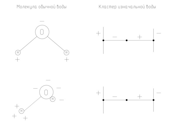 Как можно видеть, существует определенное сходство между двумя структурами. Молекула воды так же, как и кластер изначальной воды, содержит два полюса. При этом имеется вещество между этими полюсами, которое и вырабатывает соответствующее усилие каждого полюса. Множество молекул воды образуют жидкую воду. Причем энергия сцепления между молекулами воды гораздо ниже, чем энергия существования самой молекулы. Поэтому вода представляет собой некую дискретно-непрерывную материю или поле. Таким же образом кластеры изначальной воды формируют дискретно-непрерывное поле изначальной воды, которое по физическим свойствам должно иметь определенное сходство с обычной водой.