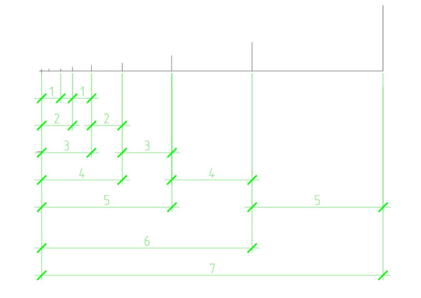 Из минимального неделимого кластера 0—5 и делимого 0—8 мы можем построить следующий кластер 8—21. Для этого необходимо размер кластера умножить на 1,618 (8*1,618=13). Число 13 будет общим размером второго кластера, при этом 8—13 (13—8=5) будет являться размером меньшей стороны в кластере, а 13—21 (21—13=8) будет являться размером большей стороны в кластере.
