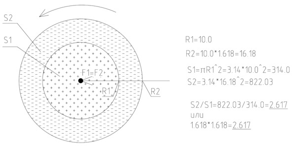 Вокруг массового объекта формируется «водоворот» изначальной воды. При этом, чем дальше от центра водоворота, тем меньше центростремительное ускорение для кластеров изначальной воды. Для наглядности представим, что размер ближайшего кластера к центру масс равен 10 (R1=10). Второй кластер будет больше первого на 1,618. Соответственно, размер второго кластера будет 10*1,618 = 16,18 (R2 = 16,18).