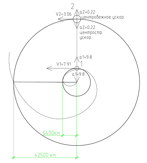 Данные для примера на рисунке 12 взяты неслучайно. Массовый объект, создающий возмущение в изначальной воде (водоворот), – это Земля. Ускорение свободного падения у поверхности Земли 9,8 м/с2. При этом расстояние от центра масс Земли около 6400 км. На расстоянии от центра масс Земли в 42500 км находится геостационарная орбита. Скорость спутников на этой орбите составляет 3,06 км/с.