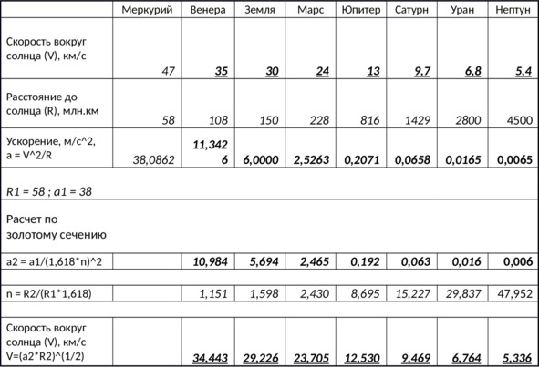 В верхней части таблицы представлены общеизвестные данные по средней скорости вращения планет по орбите вокруг Солнца и по расстоянию до Солнца. Затем производится расчет центростремительного ускорения каждой планеты по отношению к центру масс водоворота, создаваемого Солнцем. После этого в качестве «исходного» расчетного кластера принимается кластер размером с радиус усредненной орбиты Меркурия (R1=58 млн. км), при этом центростремительное ускорение для Меркурия составляет a1=38 м/с2.