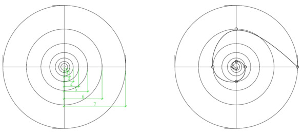 Теперь в исходной начальной точке физического кластера (2), да и всех остальных расчетных кластеров, приложим вращательное усилие, моделируя воздействие массового объекта на изначальную воду. В результате получим водоворот кластеров воды с условными границами, определяемыми расчетными кластерами. Данный водоворот изображен на рисунке 10. Кластеры вращаются своего рода как эксцентрик вокруг своего центра масс вращения: с одной стороны кластера линейная скорость быстрее, с другой медленнее. Потому что центр масс расчетного кластера (центр вращения) смещен. Одна сторона кластера больше другой на 1,618. Поэтому при вращении самого кластера создается засасывающее усилие по направлению к стороне с большей линейной скоростью, т. е. к меньшей стороне кластера. В это же время на противоположной стороне кластера создается усилие, которое пытается компенсировать засасывающее усилие. При этом, чем ближе кластеры к общему центру масс, тем меньше сам расчетный кластер. К примеру, отталкивающее усилие в кластере 7 меньше, чем засасывающее усилие в кластере 6, а в кластере 6 меньше, чем в 5 и т. д. Потому что, чем ближе кластер к общему центру масс вращения, тем быстрее он вращается вокруг своего эксцентрика и вокруг общего центра масс. Таким образом, в результате формируется усилие по притяжению кластеров к общему центру масс по графику функции, построенном по числам золотого сечения (рис. 10 справа).