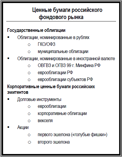 Она может использоваться в расчетах, быть предметом залога, храниться в течение ряда лет или бессрочно, передаваться по наследству, служить подарком и т. д. Список присутствующих на российском рынке ценных бумаг приведен на иллюстрации рядом.