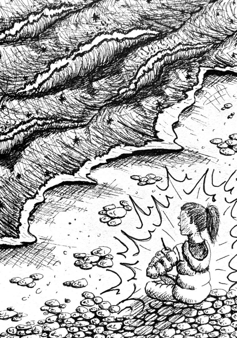 Казалось, девушка забыла о присутствии двоих сущностей рядом. Не говоря ни слова, Ментор вытащил из воздуха за собой рюкзачок Марты и протянул ей. Она, в свою очередь, достала деревянный планшет, с листом бумаги, кисти и краски, и по-турецки уселась прямо на мокрую холодную гальку.