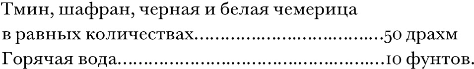 Давать пить по пять унций с небольшим количеством миндального масла. Если у больного запор, добавлять щепотку скаммония.