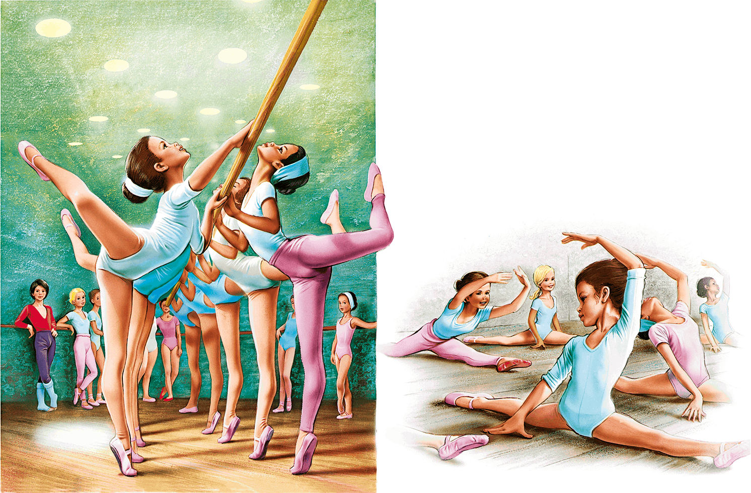 – Смотри, Пируэт, вот трудная фигура. Упражнение на гибкость. Попробуй удержи за пятку ногу выше головы!