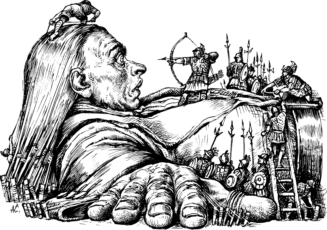 Не стоит утомлять внимание читателя подробным описанием наших приключений в этих морях; достаточно сказать, что при переходе в Ост-Индию мы были отнесены страшной бурей к северо-западу от Ван-Дименовой земли. Согласно наблюдениям, мы находились на 30° южной широты. Двенадцать человек нашего экипажа умерли от переутомления и дурной пищи; остальные были в состоянии полного изнеможения. 5 ноября (начало лета в этих местах) было очень пасмурно, так что матросы только на расстоянии полукабельтова от корабля заметили скалу; между тем страшный ветер гнал корабль прямо на эту скалу, и он мгновенно разбился в щепки. Шестеро из экипажа, в том числе я, спустили шлюпку на воду и благополучно отъехали от корабля и скалы. По моим расчетам, мы шли на веслах около трех миль, пока совсем не выбились из сил, так как были переутомлены уже на корабле. Поэтому мы отдались на волю ветра и волн, и через полчаса шлюпка была опрокинута внезапно налетевшим с севера шквалом. Что сталось с моими товарищами по шлюпке, а равно и с теми, которые нашли убежище на скале или остались на корабле, не могу сказать; думаю, что все они погибли. Что касается меня самого, то я поплыл наугад, подгоняемый ветром и приливом. Я часто опускал ногу, но не мог нащупать дно; и вот в то время когда я совсем уже выбился из сил и не способен был больше бороться с волнами, буря значительно утихла, и я почувствовал под ногами землю. Дно в этом месте было так отлого, что мне пришлось пройти более мили, прежде чем я добрался до берега; было, должно быть, около девяти часов вечера. Я прошел с полмили, но не обнаружил никаких признаков жилья и населения, или по крайней мере был слишком слаб, чтобы различить что-нибудь. Я чувствовал крайнюю усталость; от усталости, жары, а также от выпитой мной еще на корабле полпинты водки меня сильно клонило ко сну. Я лег на траву, которая была здесь очень низкая и мягкая, и заснул так крепко, как не спал никогда в жизни. По моему расчету, сон мой продолжался около девяти часов, потому что, когда я проснулся, было уже совсем светло. Я хотел встать, но не мог пошевельнуться; я лежал на спине и чувствовал, что мои руки и ноги с обеих сторон крепко привязаны к земле и точно так же прикреплены к земле мои длинные и густые волосы; а все мое тело, от подмышек до бедер, опутано целой сетью тонких бечевок. Я мог смотреть только вверх; солнце начинало жечь, и свет его ослеплял глаза. Кругом меня слышался какой-то глухой шум, но в том положении, в котором я лежал, я не мог видеть ничего, кроме неба. Вскоре я почувствовал, как что-то живое задвигалось у меня на левой ноге, мягко поползло по груди и остановилось у самого подбородка. Опустив глаза как можно ниже, я различил перед собою человечка, ростом не более шести дюймов, с луком и стрелой в руках и колчаном за спиной. В то же время я почувствовал, как вслед за ним на меня взбирается по крайней мере еще около сорока подобных же (как мне показалось) созданий. От изумления я так громко вскрикнул, что они все в ужасе разбежались, причем некоторые из них, как я узнал потом, соскакивая и падая с моего туловища на землю, получили сильные ушибы. Однако скоро они возвратились снова, и один из них, отважившийся подойти так близко, что ему было видно все мое лицо, в знак удивления поднял кверху руки и глаза и тоненьким голосом, но отчетливо прокричал: Гекина дегу